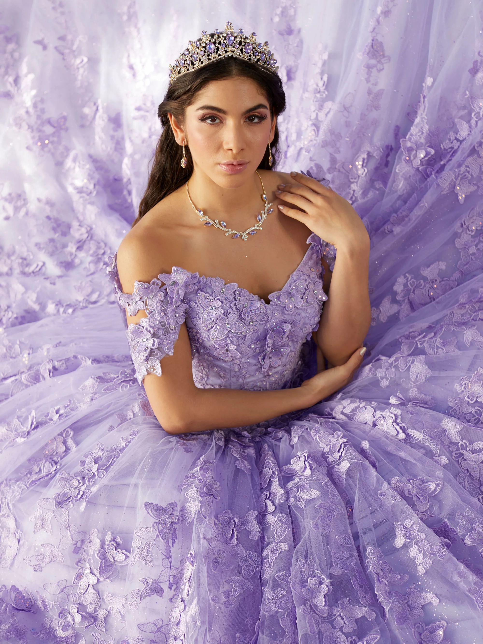 Enchanting quinceanera dress is beautifully adorned with three-dimensional embroidered lace butterflies featured on the bodice, and interchangeable cold-shoulder or off-the-shoulder strap options. The glitter tulle gown skirt features a trellis embroidery down the skirt, a royal train and lace-up back closure.