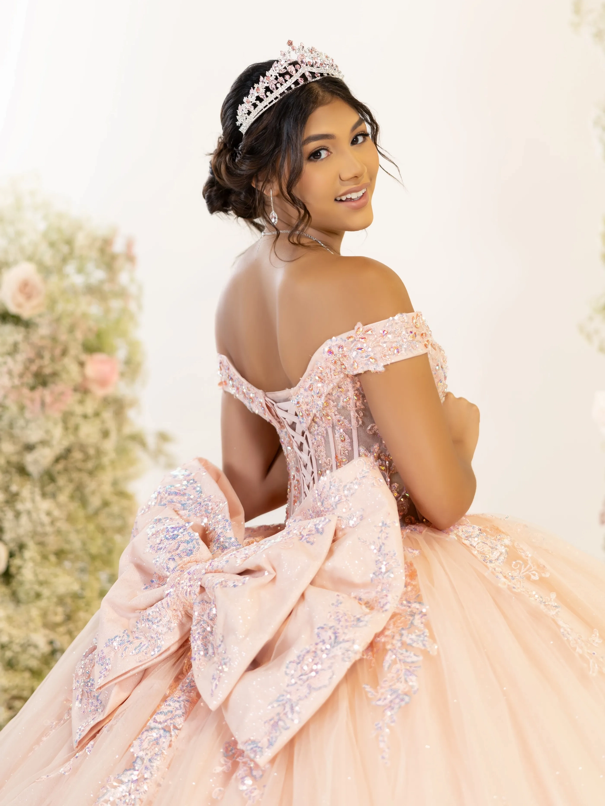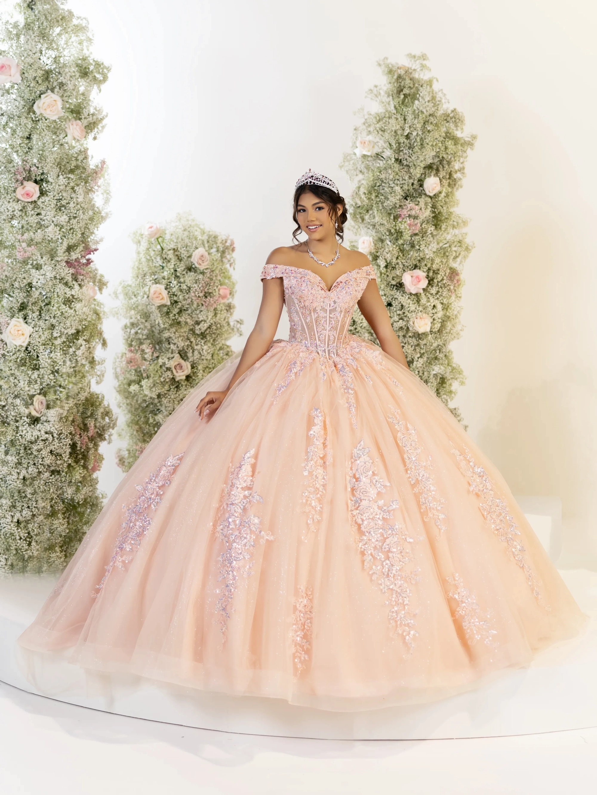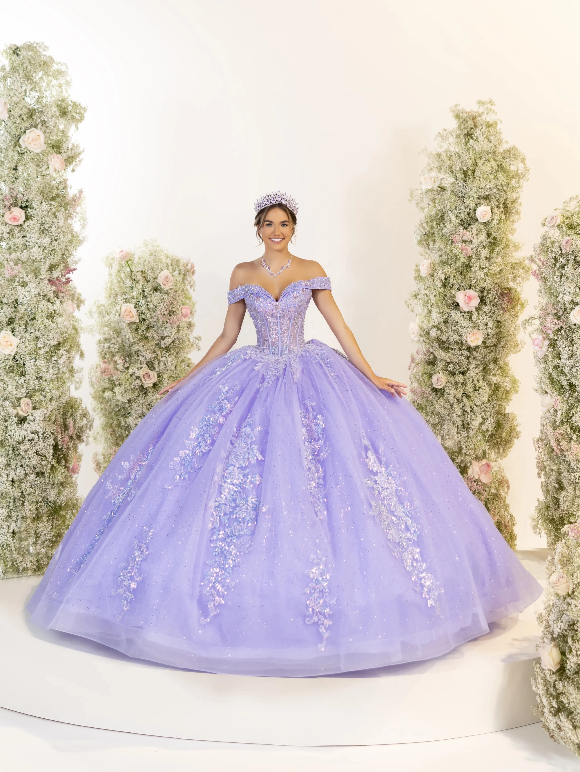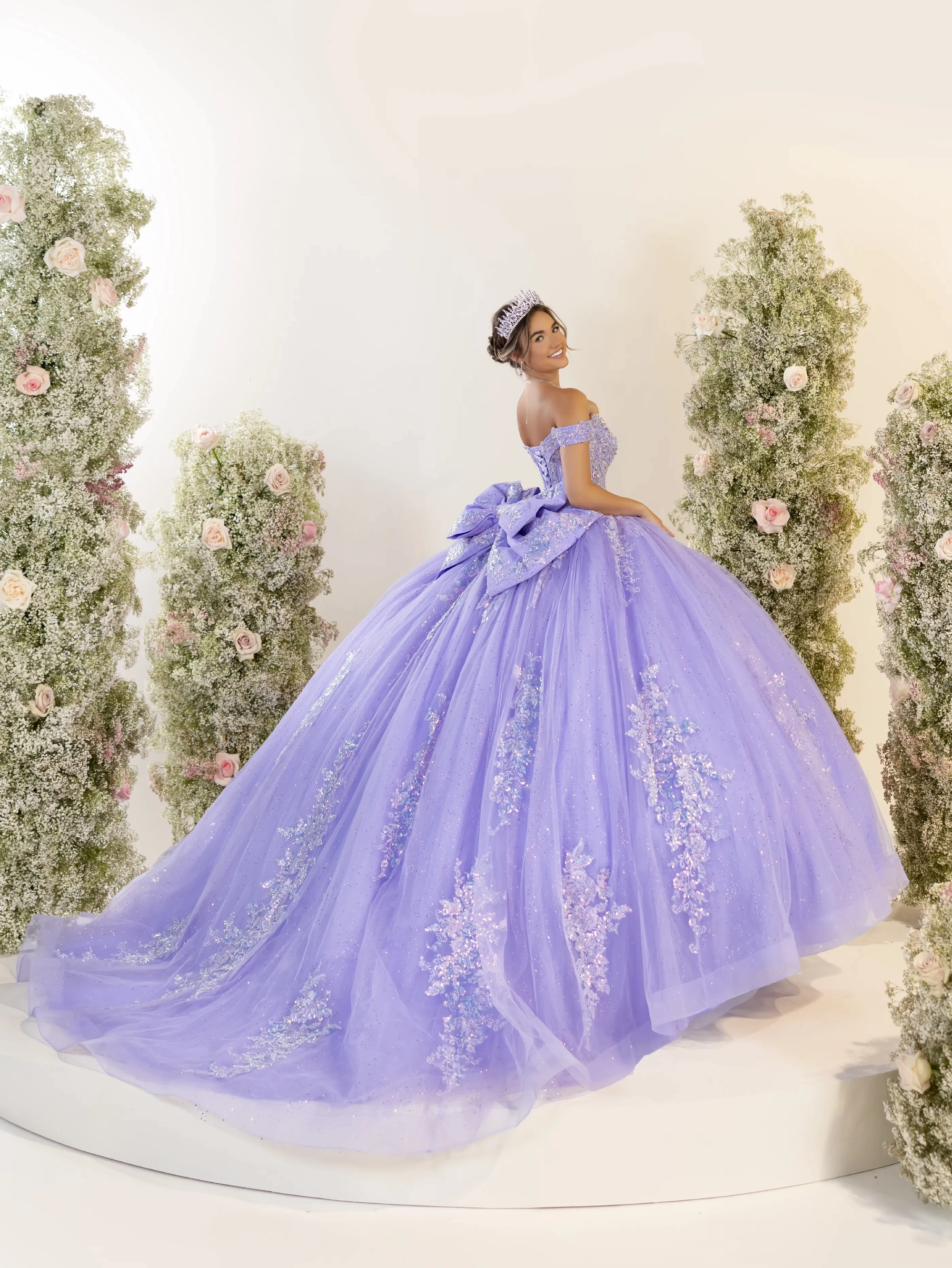 Off-the-shoulder portrait neckline embellished with embroidery beaded lace on a structured sheer bodice, vertical panels intricate matching embroidery lace scatter throughout out the chapel tulle skirt train.