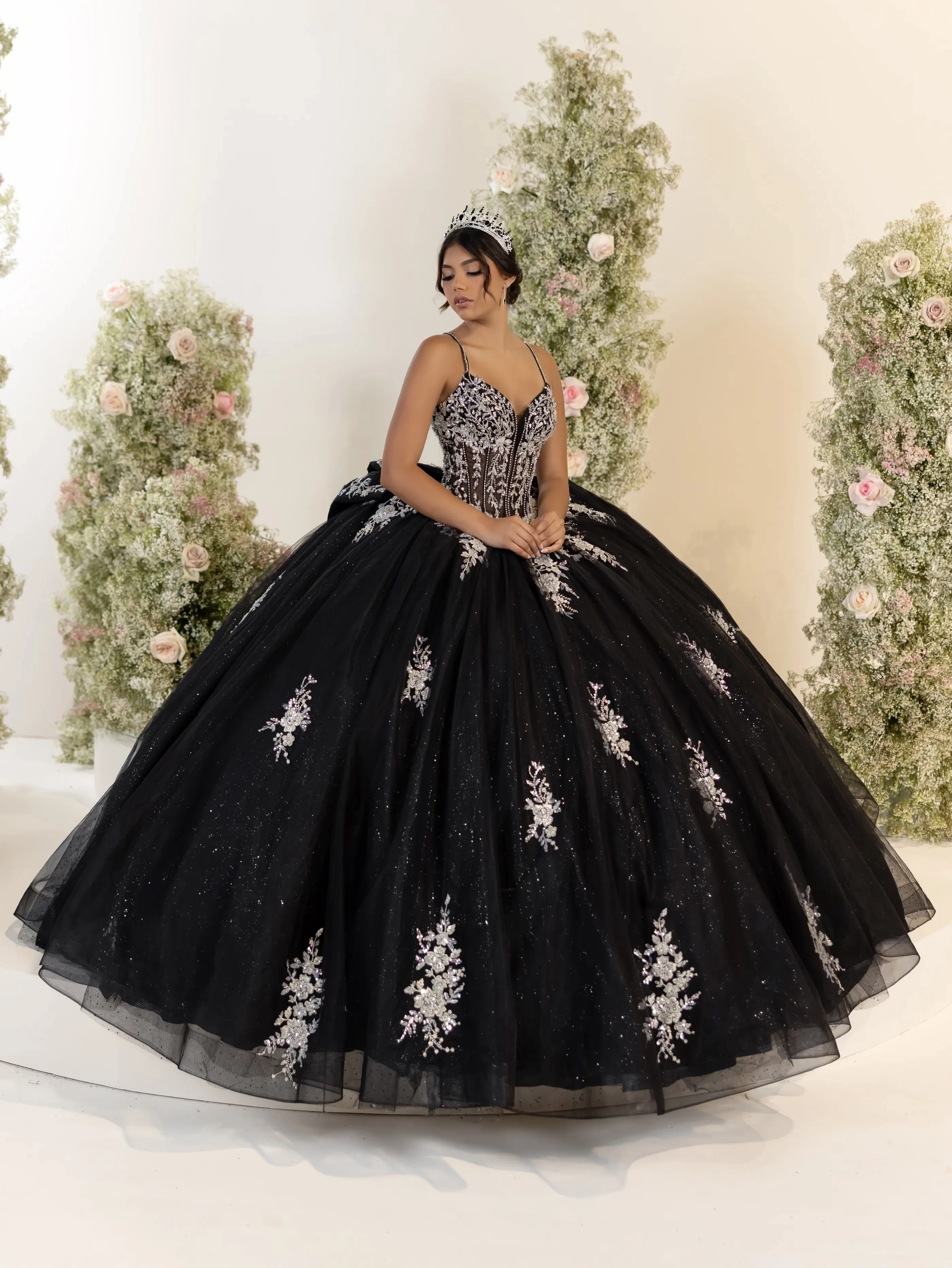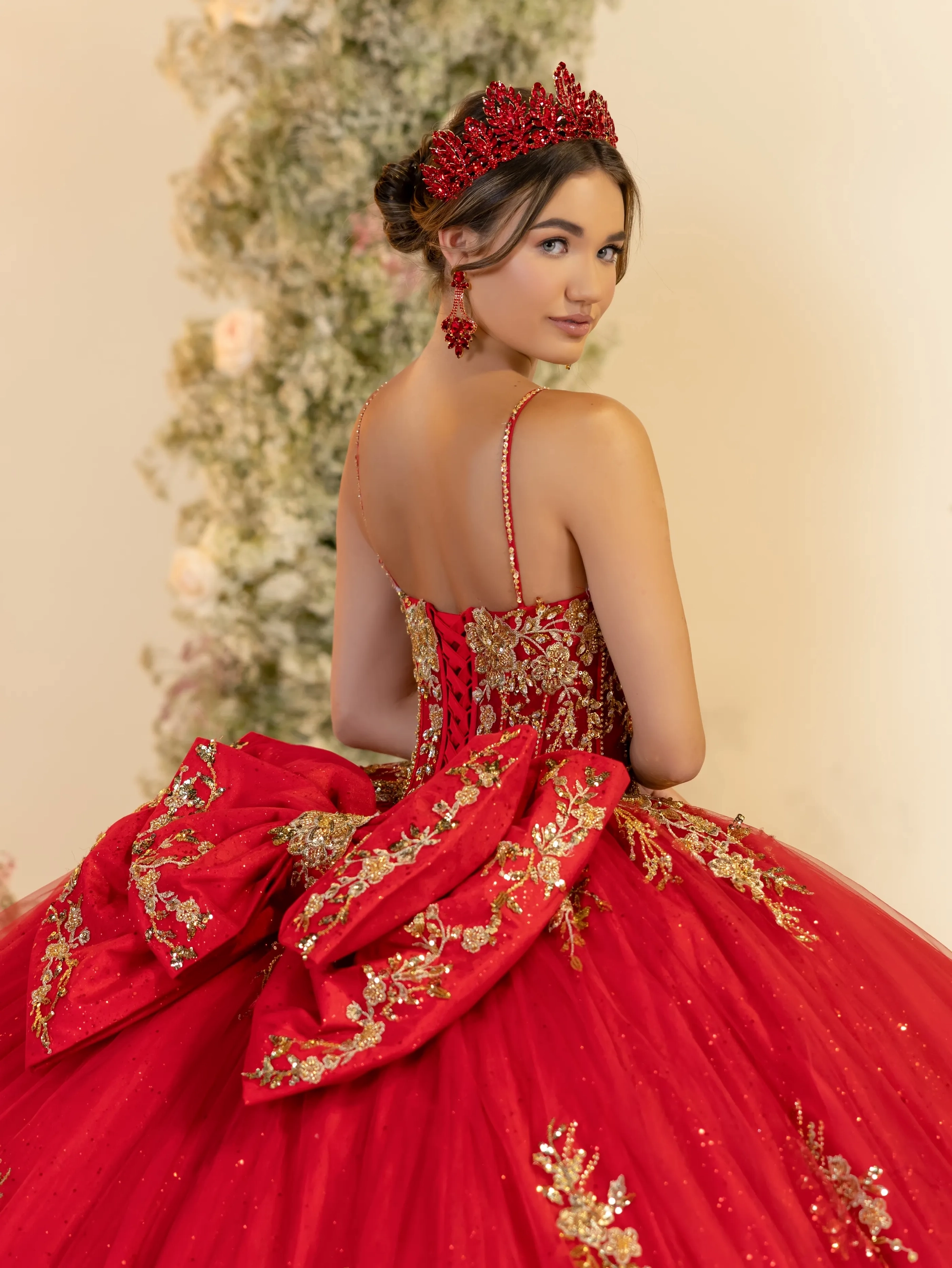 Spaghetti straps sweetheart neckline embellished with beaded embroidery lace fitted corset style sheer bodice, matching embroidery lace appliques throughout the voluminous chapel length tulle skirt.