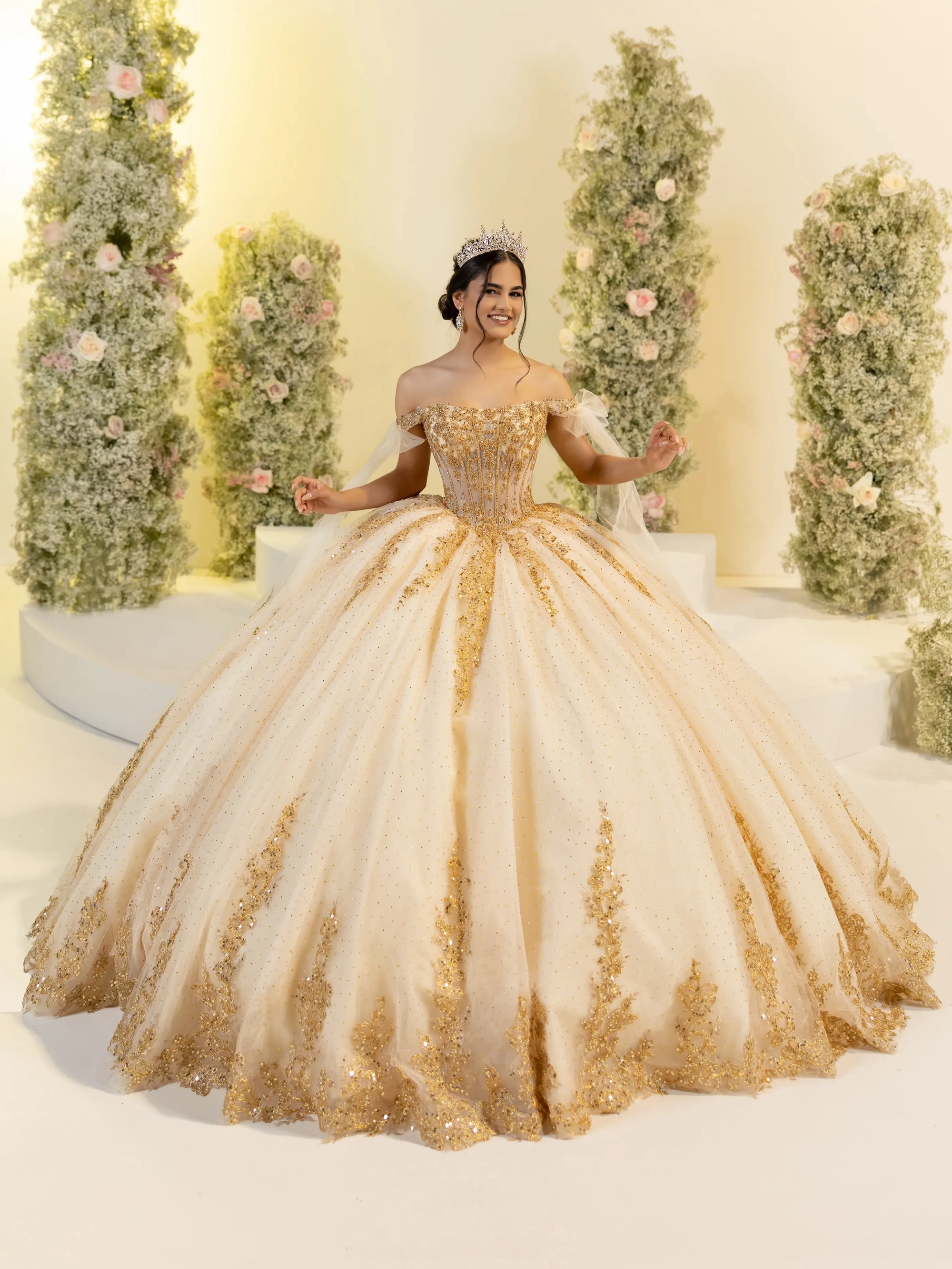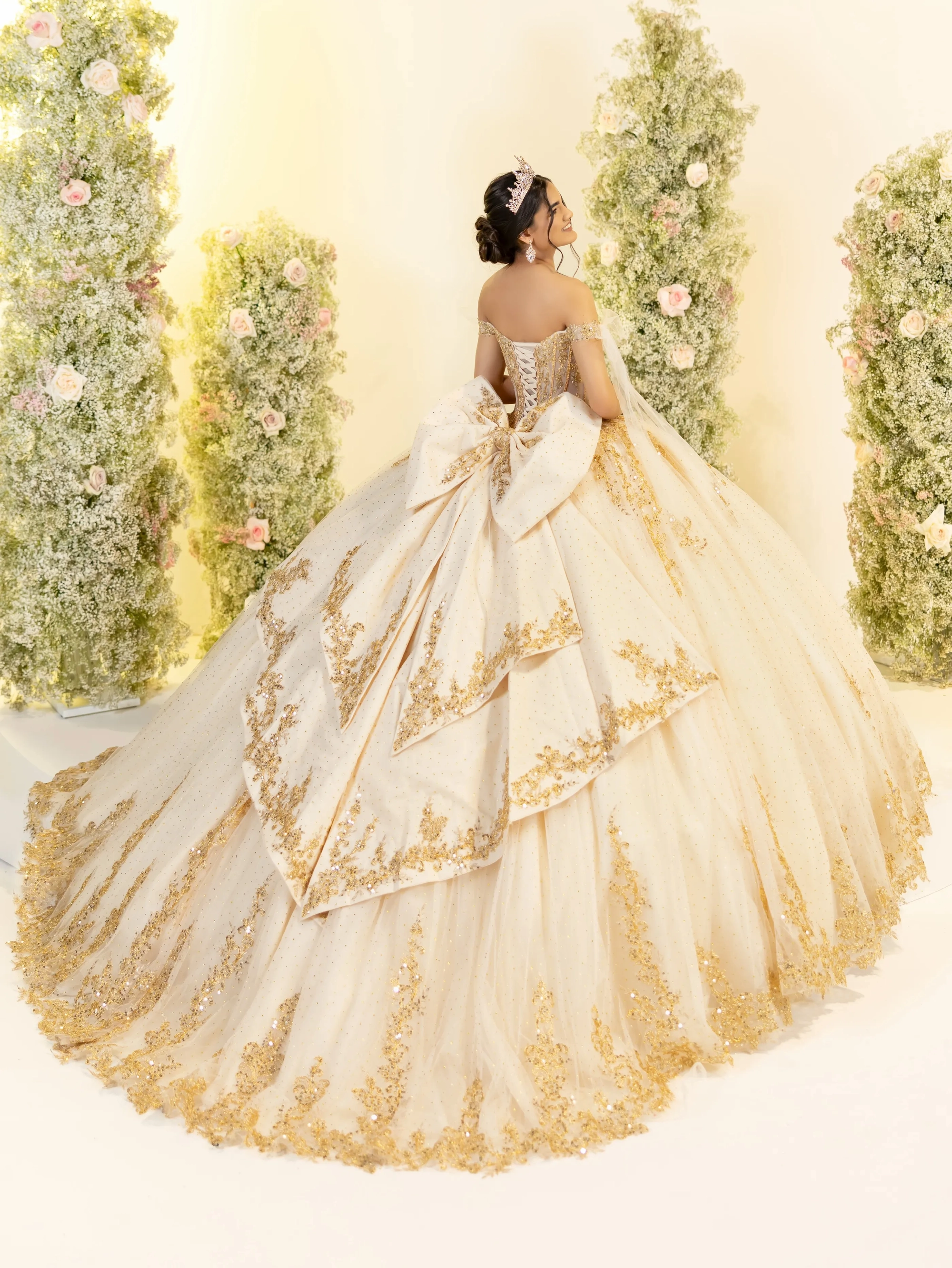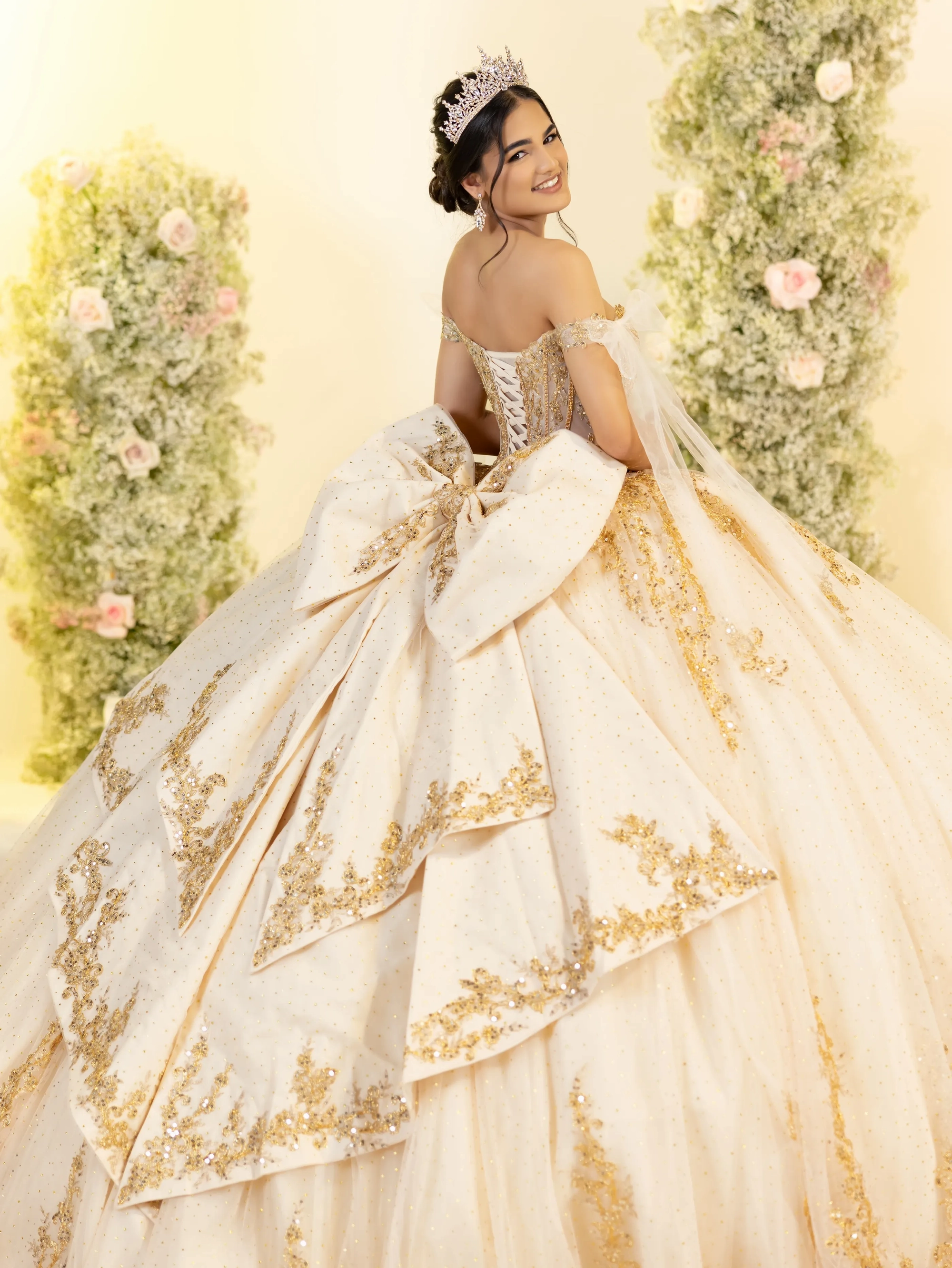 This illusion corset ballgown radiates with metallic lace and all-over crystals; scoop neckline is completed with off-shoulder straps with tulle bowties; finished with a large, detachable, dual-tailed bow.