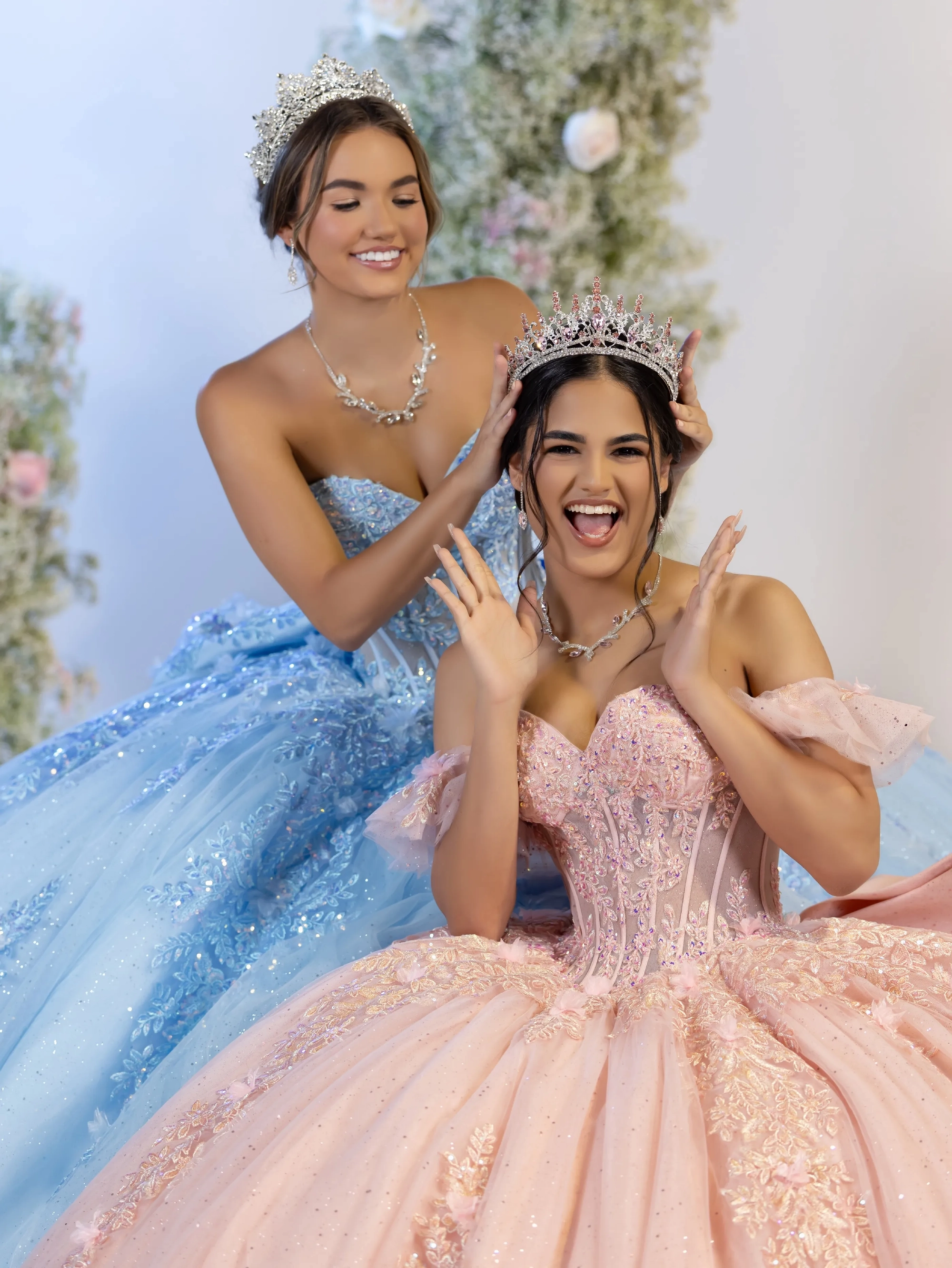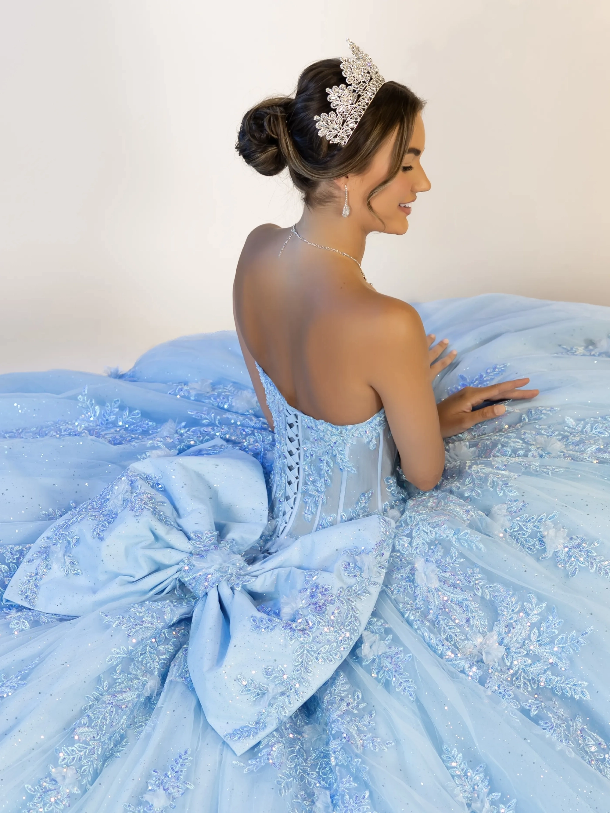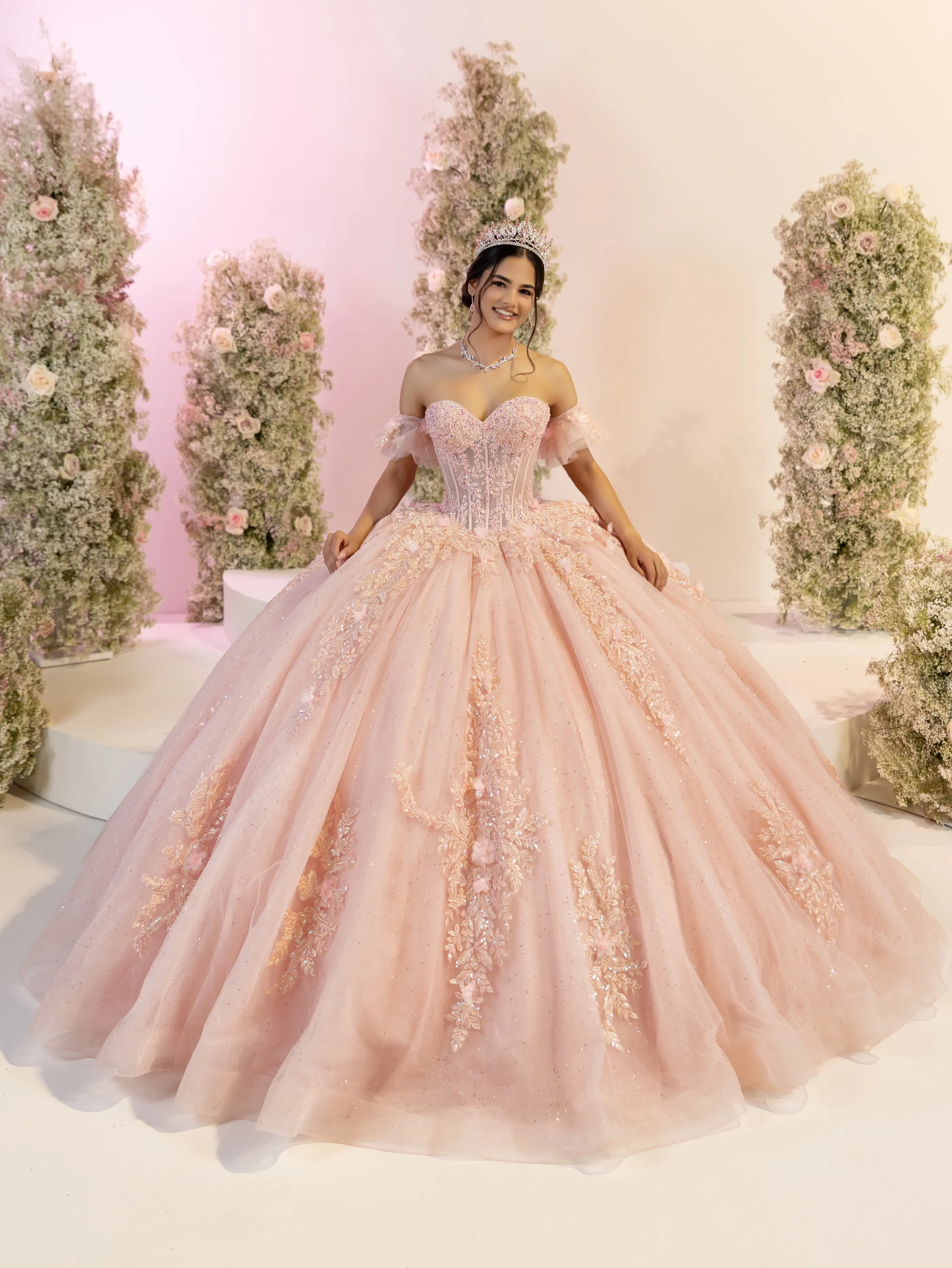 Sweetheart neckline with detachable deliciated ruffle tulle sleeves, adorned with embroidery beaded and sequins lace corset-style sheer bodice, matching lace appliques throughout the voluminous chapel length tulle skirt.