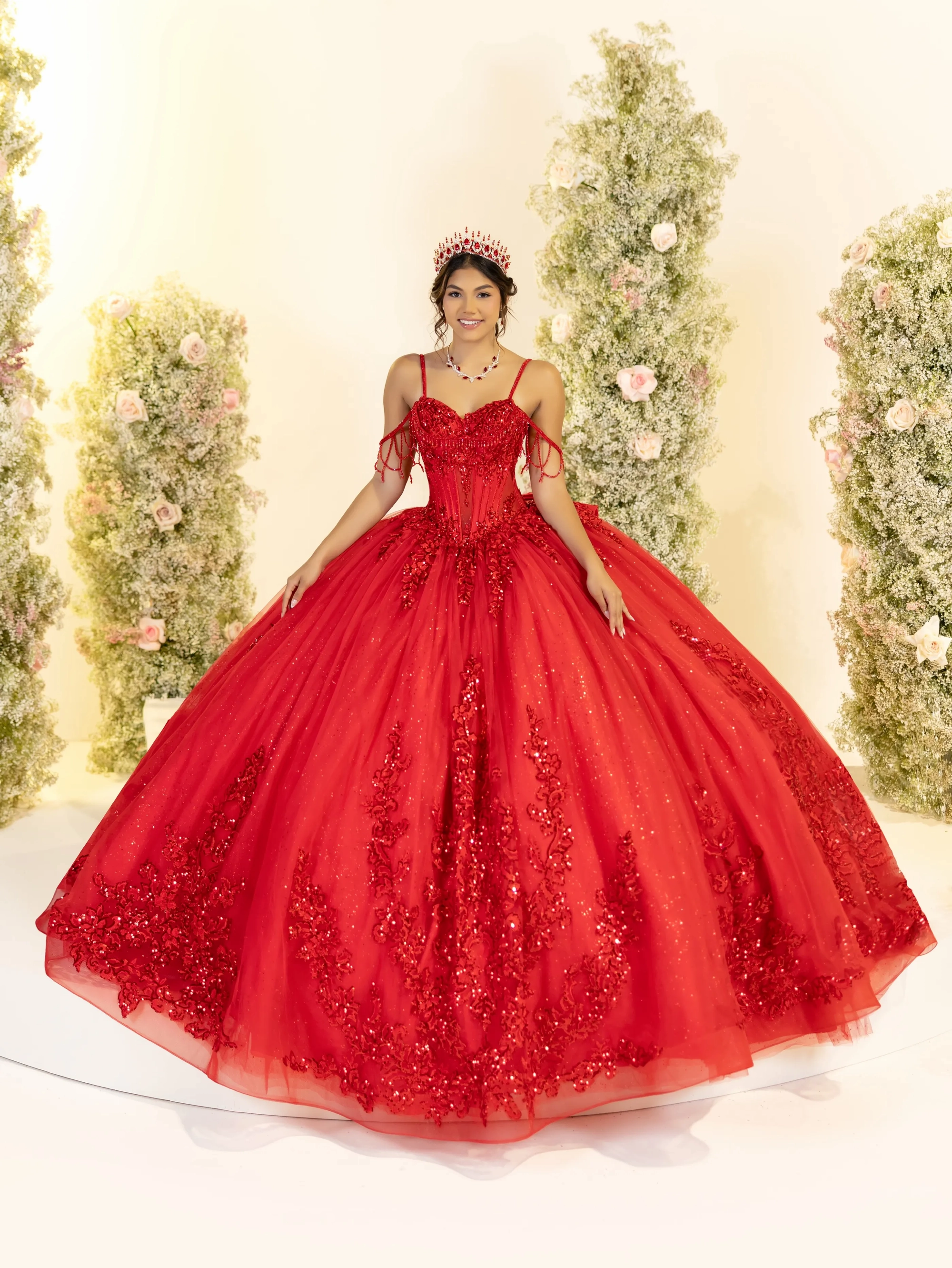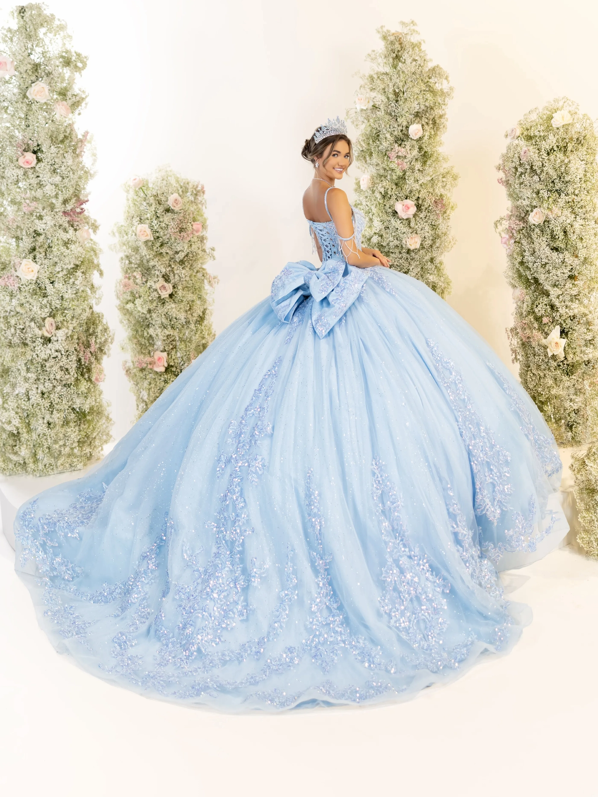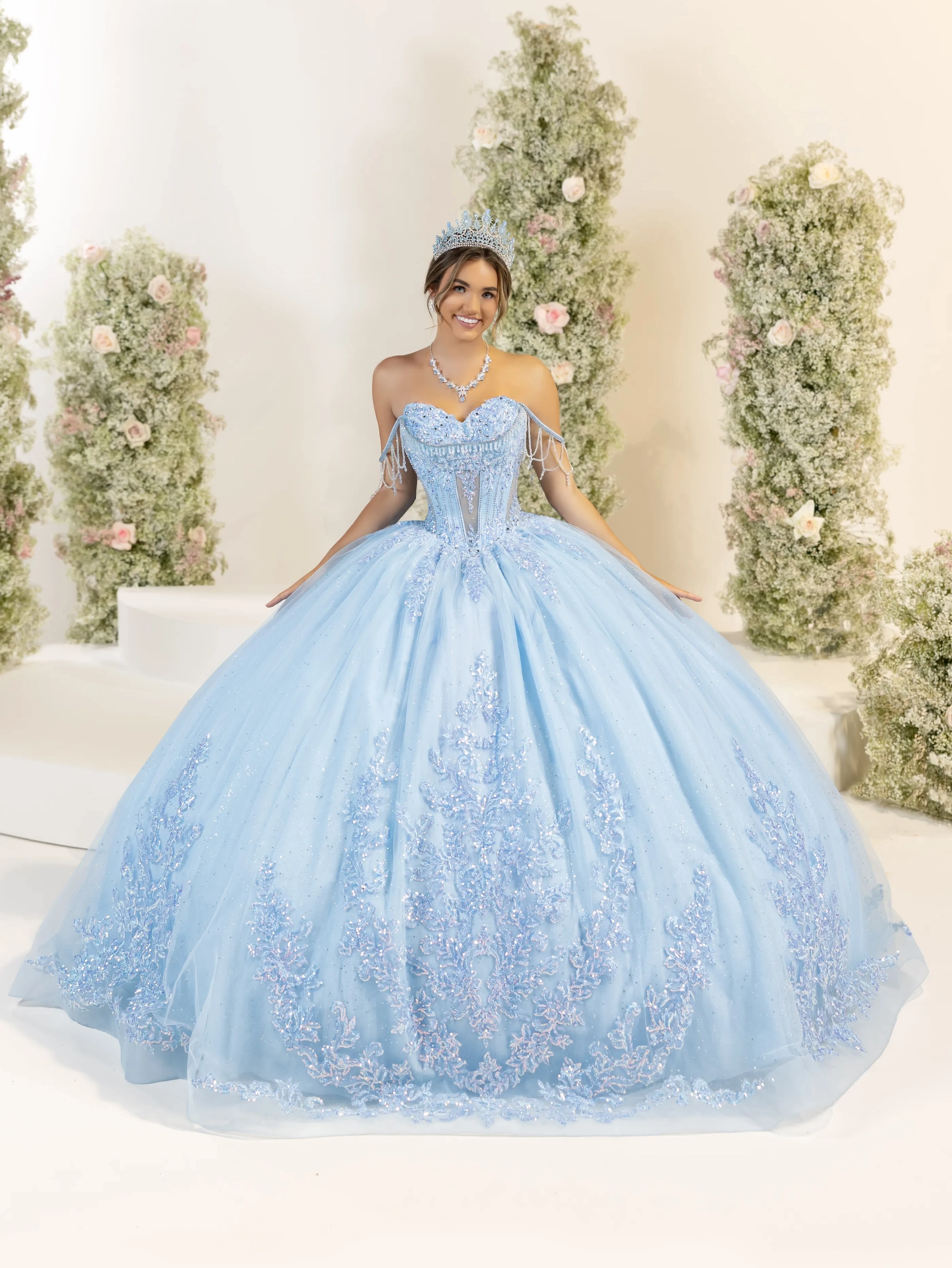 Sweetheart neckline accented by delicate off-the-shoulder draped strands of crystal beading, the fitted corset-style bodice adorned with intricate embroidery and shimmering beadwork flows seamlessly into the voluminous chapel train tulle skirt.